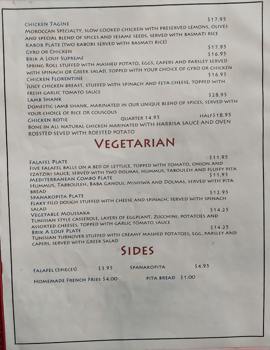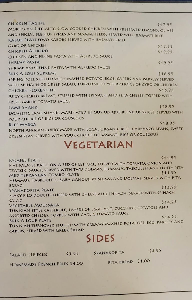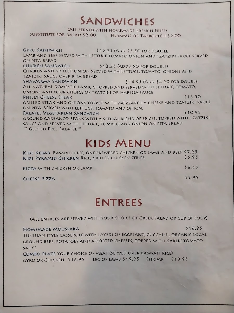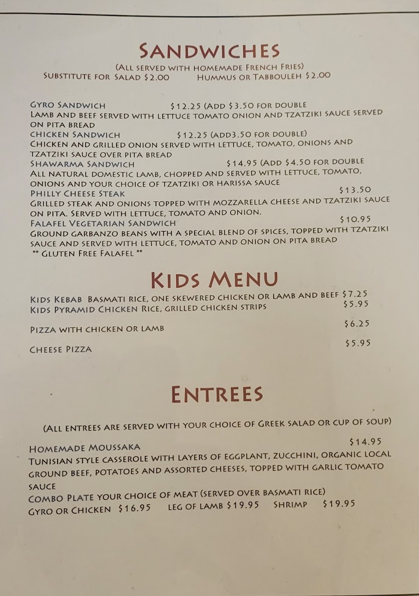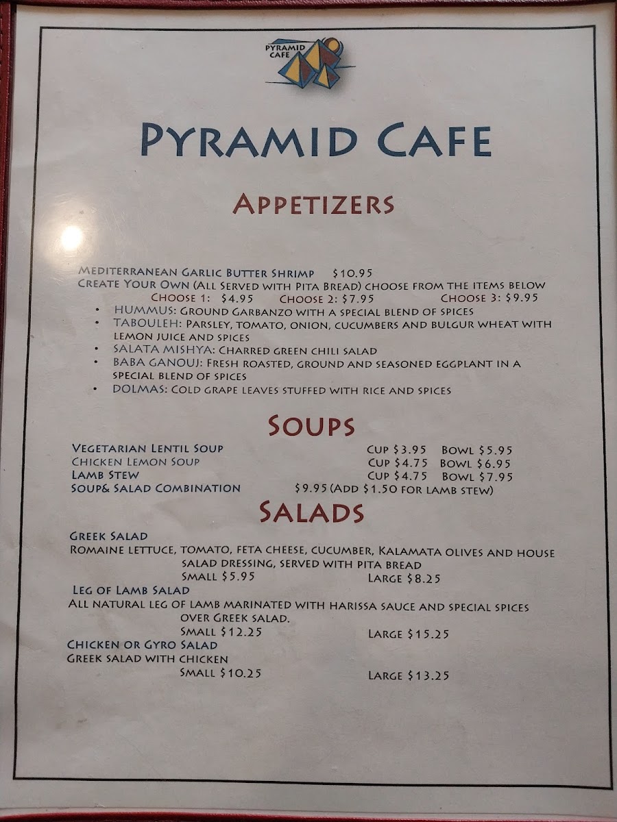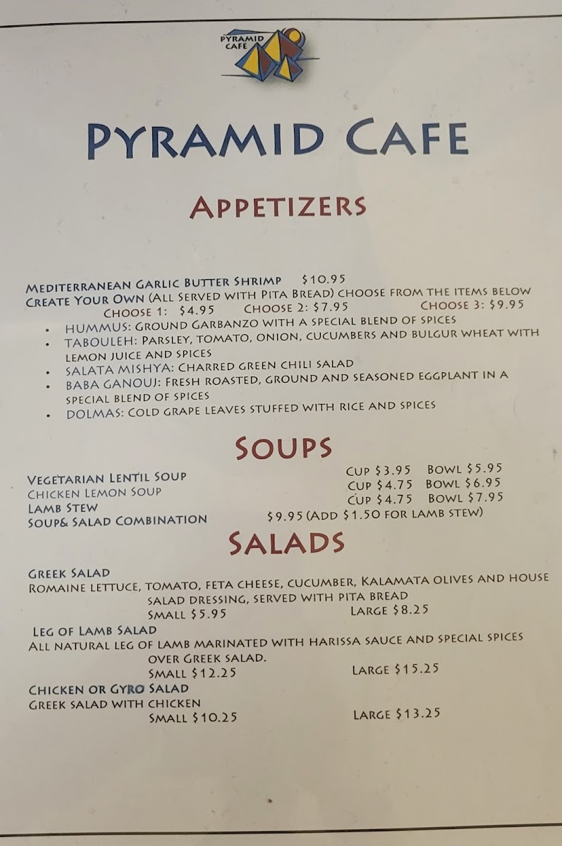 From a reviewer’s perspective, the menu at Pyramid Cafe, located at 505 Cordova Rd in Santa Fe, delivers a concise yet satisfying introduction to Mediterranean-inspired comfort food. The sandwich selection stands out for its balance between familiar flavors and traditional recipes, with options like the Gyro Sandwich, Philly Cheese Steak, Falafel Sandwich, Chicken Sandwich, and Shawarma Sandwich offering something for both meat lovers and plant-based diners. Each sandwich reflects a focus on hearty portions and well-known Mediterranean seasonings, making them approachable while still feeling distinctive. For those seeking vegetarian-friendly choices or a more complete meal, the vegetarian section is a strong highlight, particularly the Falafel Plate and the Mediterranean Combo Plate, which bring together classic components into well-rounded dishes. Overall, the menu at Pyramid Cafe feels thoughtfully curated rather than overwhelming, emphasizing quality and variety within a focused range. As a conclusion, this menu successfully represents the restaurant’s identity: simple, flavorful Mediterranean dishes designed to satisfy different tastes while remaining accessible, making Pyramid Cafe a solid choice for anyone looking to enjoy reliable Mediterranean fare in Santa Fe.